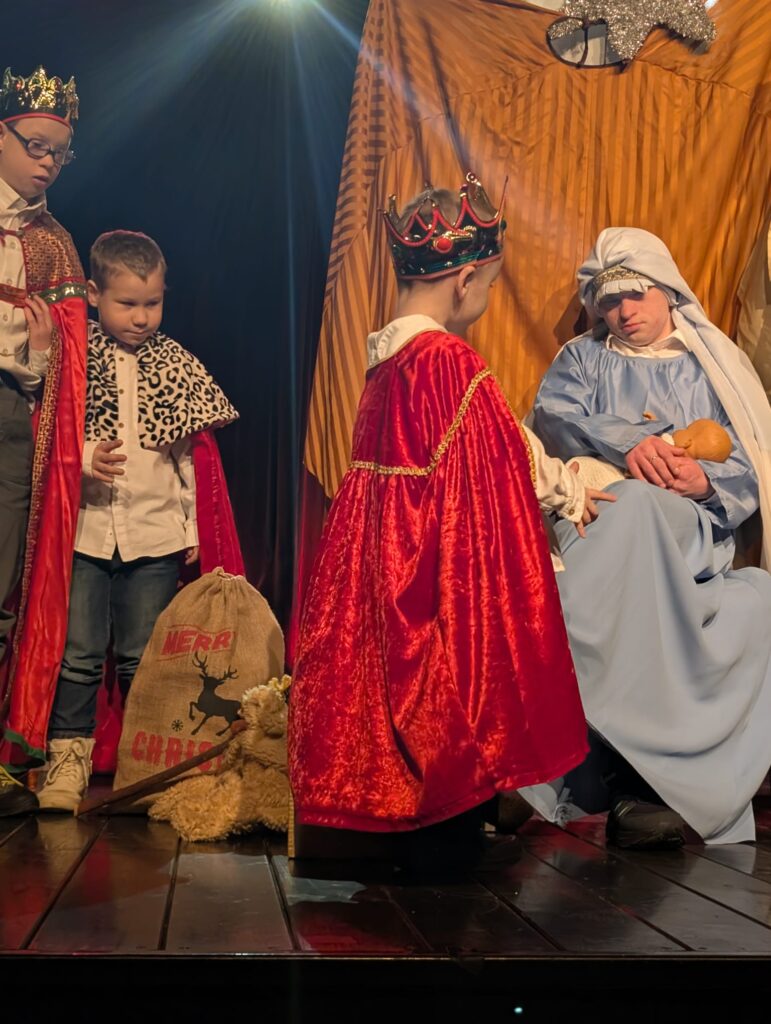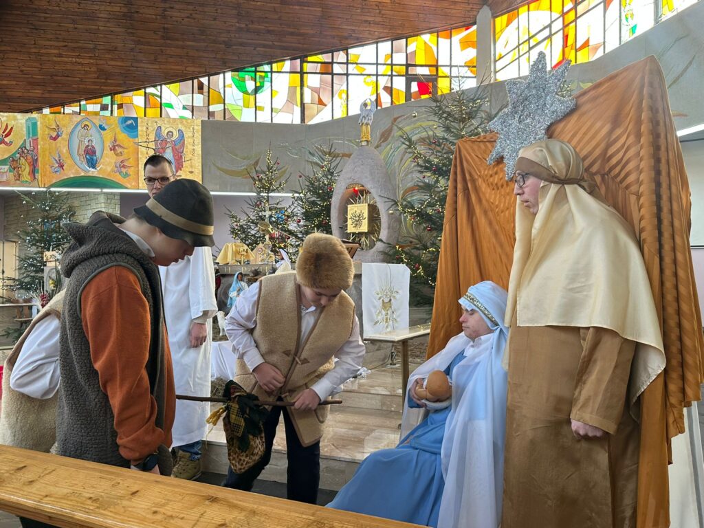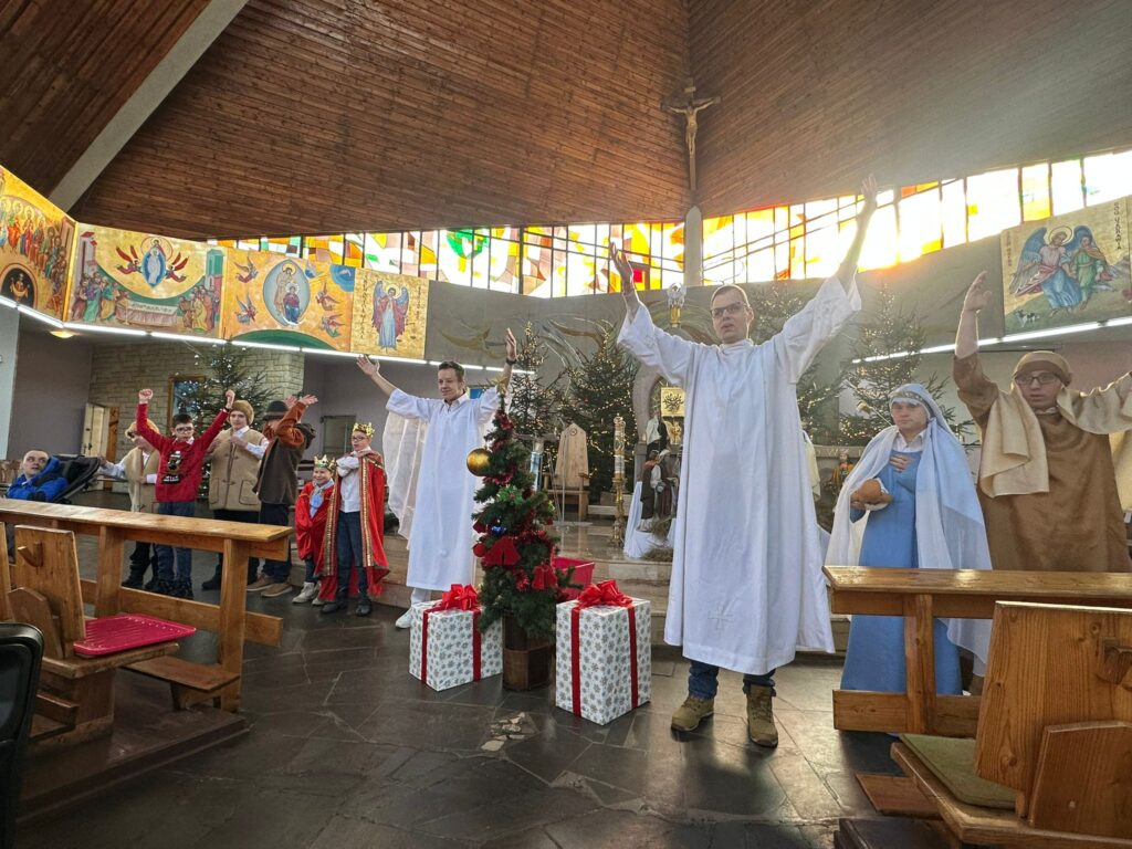 Pierwszy występ miał miejsce 6 stycznia w Kościele pw. Matki Boskiej Częstochowskiej w Drogomyślu, a kolejne 18 stycznia w Chybiu i 25 stycznia w naszym strumieńskim kościele. Przedstawienie pt. „Każdy może mieć swój udział w Bożym Narodzeniu”, którego scenariusz i reżyserię przygotowała Pani Justyna Drałus, porwało zarówno naszych chłopców, jak i zgromadzonych widzów. Spektakl zagrany sercem, pełen prostoty i autentyczności, stał się dla naszych młodych artystów nie tylko wydarzeniem artystycznym, ale także ważnym doświadczeniem duchowym i wspólnotowym.