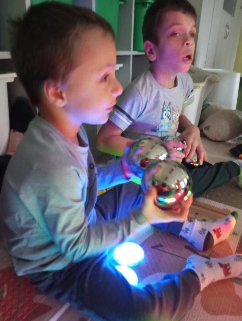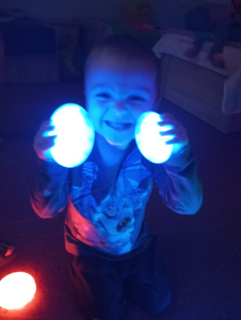 Radości i ciekawości świata u nas nie brakuje! Sensoryczne zabawy cieszą się ogromnym zainteresowaniem, a wesołe eksperymenty ze światłem oraz kolorowe zabawki manipulacyjne robią prawdziwą furorę. To nie tylko świetna zabawa, ale także ważny element wspierania rozwoju i odkrywania świata wszystkimi zmysłami.