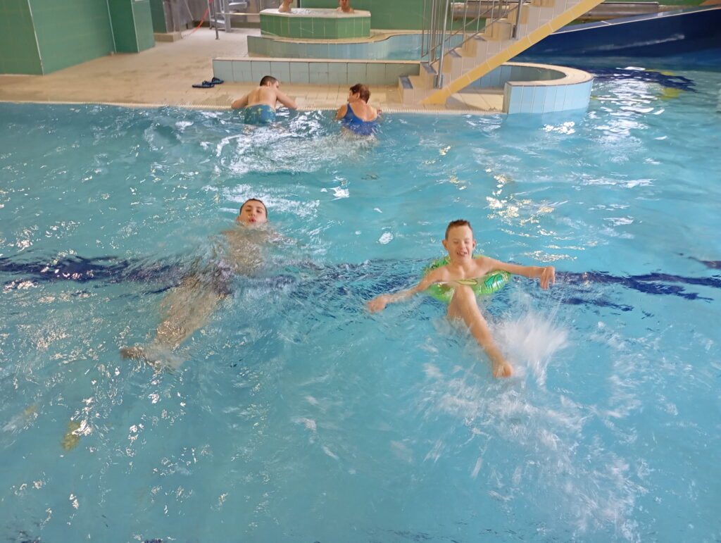 Podczas tegorocznych ferii nie zabrakło wyjazdu na basen. Ciepła woda, ruch i wspólna zabawa pozwoliły na chwilę zapomnieć o zimowej pogodzie .